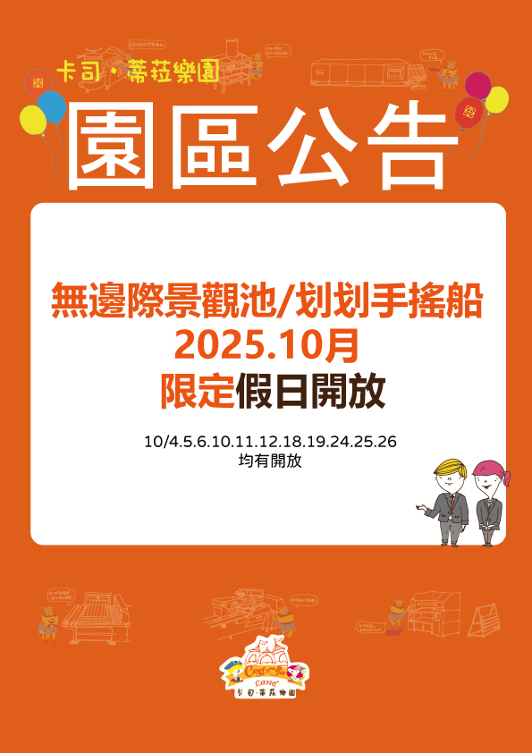 【園區公告】2025.10月景觀池.划划手搖船 假日限定2025-09-27/在: 園區公告, 最新消息 /通過: konig0108 【景觀池/手搖船 營業公告】10月假日限定 真的是夏天要結束了~無邊際景觀池與划划手搖船開放日為 10/4.5.6.10.12.18.19.24.25.26 平日 ————————————————————– 划划手搖船 09:30~16:30 可用票券折抵 體驗價 $100/5分鐘 (不需另購景觀池門票不可下水) 無邊際景觀池 09:30~16:30 可用票券折抵 成人票 $100(140cm↑) 兒童票 $150(90–140cm需家長陪同,陪同者亦須購票) https://castellaland.com/wp-content/uploads/2025/09/20250925景觀池手划船公告-官網小圖.jpg 450 800 konig0108 /wp-content/uploads/2022/02/castella-land-logo.png konig01082025-09-27 13:44:002025-09-25 13:45:30【園區公告】2025.10月景觀池.划划手搖船 假日限定